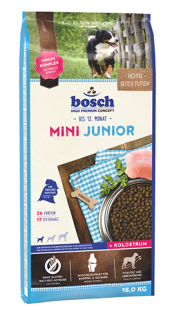 MINI JUNIOR wird ohne glutenhaltiges Getreide unter Verwendung von frischem Geflügel (min. 25 %) hergestellt.