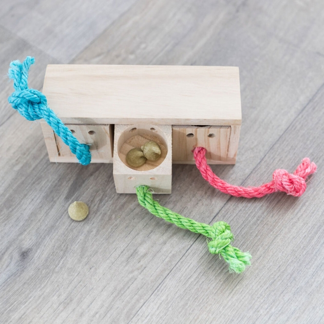 Ob Kaninchen oder Ratte – mit dem Snack Würfel bekommt jedes Kleintier eine neue geistige Herausforderung. Das Spielzeug lässt sich mit Leckerlis befüllen und durch das Herausziehen der Schubladen kommt das Tier an seine Belohnung. Um es dem Nager leichter zu machen, gibt es große Luftlöcher und zwei Schwierigkeitsstufen. So lässt der Erfolg nicht lange auf sich warten. Natürlich ist das Holz unbehandelt und das Produkt tierschutzkonform (§18 AT).